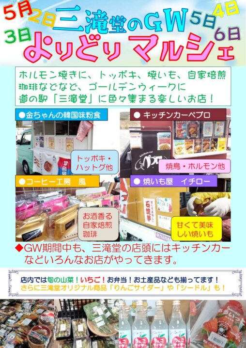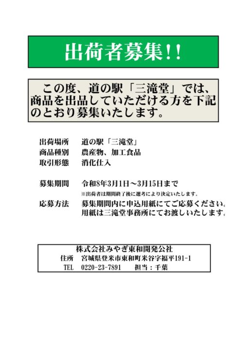 道の駅三滝堂は、三陸自動車道の中間点、登米市東和町にあります。豊かな自然に育まれた産直品の販売コーナー、レストランがございます。三陸方面や登米市への旅の休憩に、お土産のお買い物にぜひお立ち寄りください。