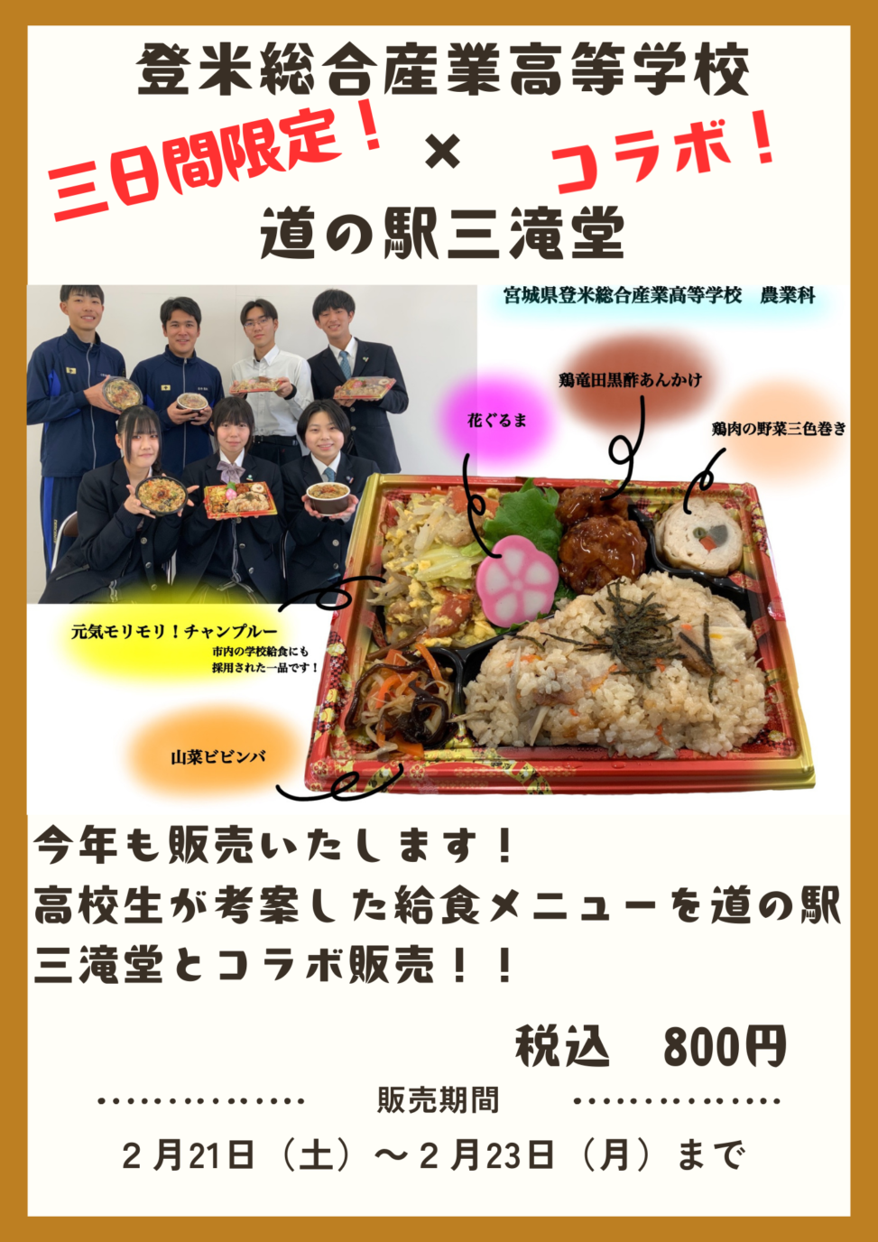 登米総合産業高校の生徒考案のお弁当!(令和8年2月21日~2月23日の3日間) 登米総合産業高校の生徒さんが地産地消推進をするために考案したメニューを道の駅「三滝堂」にてお弁当として販売します。 元気モリモリチャンプルー弁当 税込800円 道の駅「三滝堂」売店にて販売します。 2/21~2/23の3連休だけの期間限定販売となりますので、是非ご購入を! 〔登米市公式HP〕登米市/登米総合産業高校の生徒が考案した学校給食メニュー Tweet 2026年2月17日 投稿先 道の駅三滝堂から, 販売コーナーから, お弁当デリバリー ← 過去の投稿へ